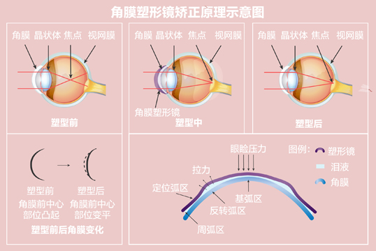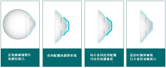 通過機械性壓迫,鏡片移動的按摩,以及眼淚的液壓等物理作用,達到壓平角膜中央的形狀,暫時減低近視度數(shù)的作用